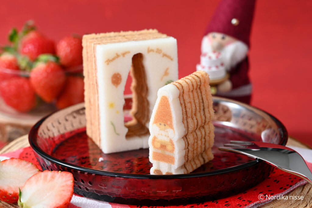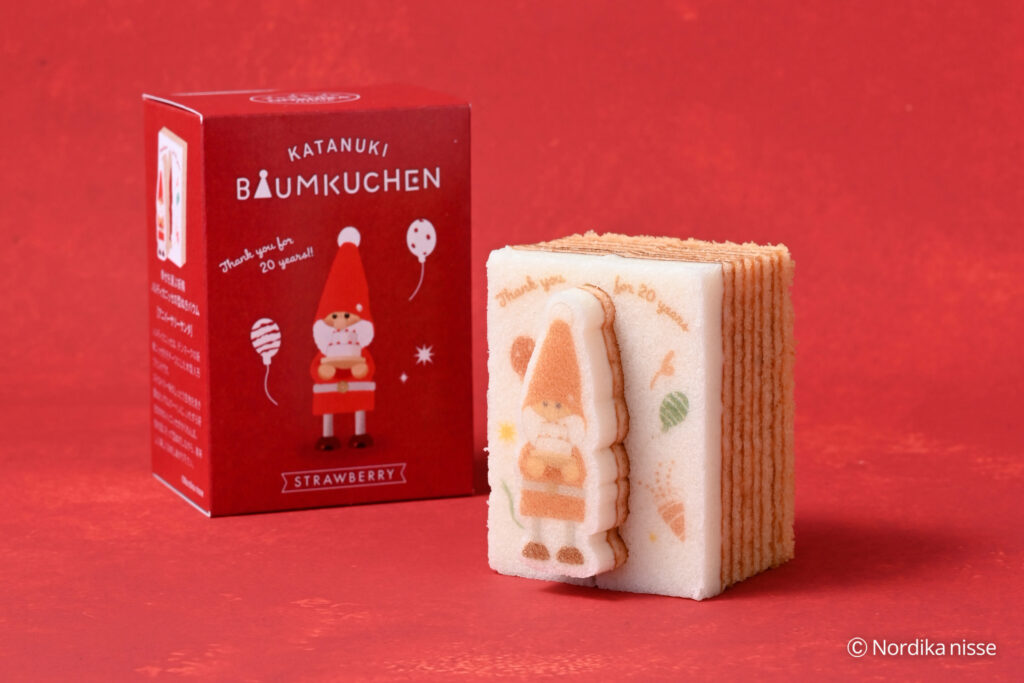 今年はノルディカニッセが日本にやってきて20周年を迎える、特別な節目。20周年を記念したコレクション、「20th Celebration Series」からケーキを持ったサンタが型ぬきバウムになって登場です。華やかに香ってほんのり甘酸っぱい、ストロベリー味。