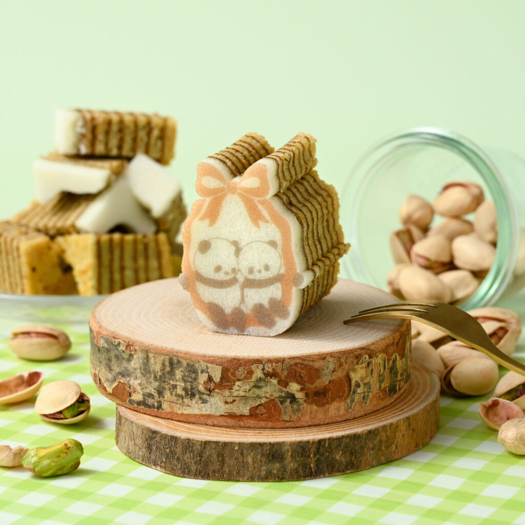 風味豊かなピスタチオを使った、特別な新フレーバーが仲間入り。香ばしい風味とナッツのコクが広がる、ピスタチオの味わいです。パンダたちが、ふんわり結ばれたリボンのブランコにゆられています。
