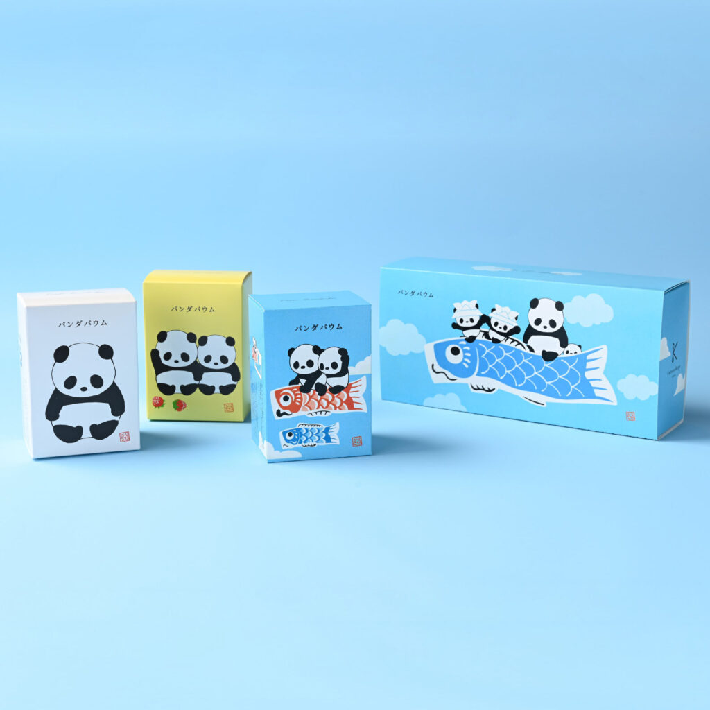 「こいのぼりパンダバウム(バナナ味)」を主役にした、パンダバウムの3個セット。子どもの日限定の、かわいいパッケージでお届けします。