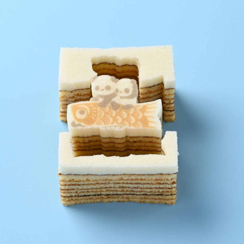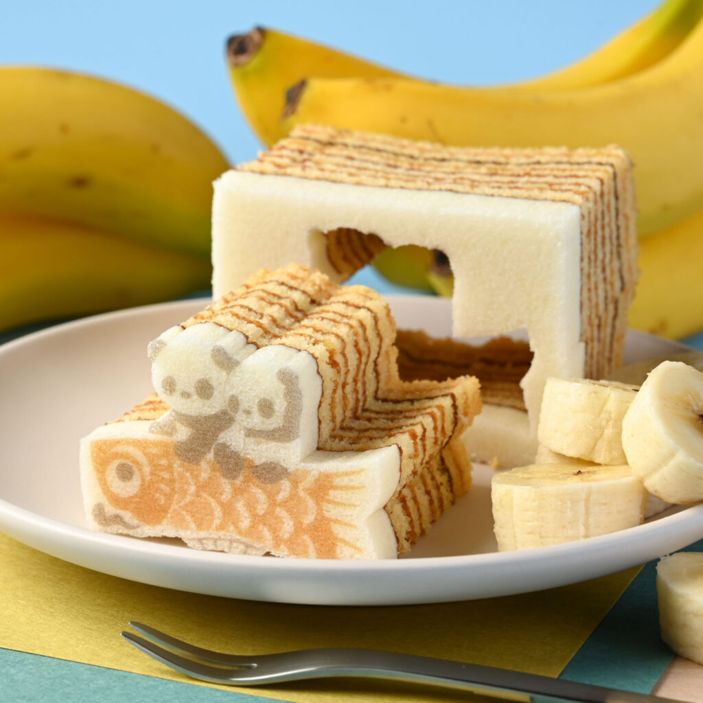 こいのぼりの背にのった、こどもパンダを型ぬきしながら楽しむバウムクーヘン。やさしい甘さが広がる、バナナの味わいです。